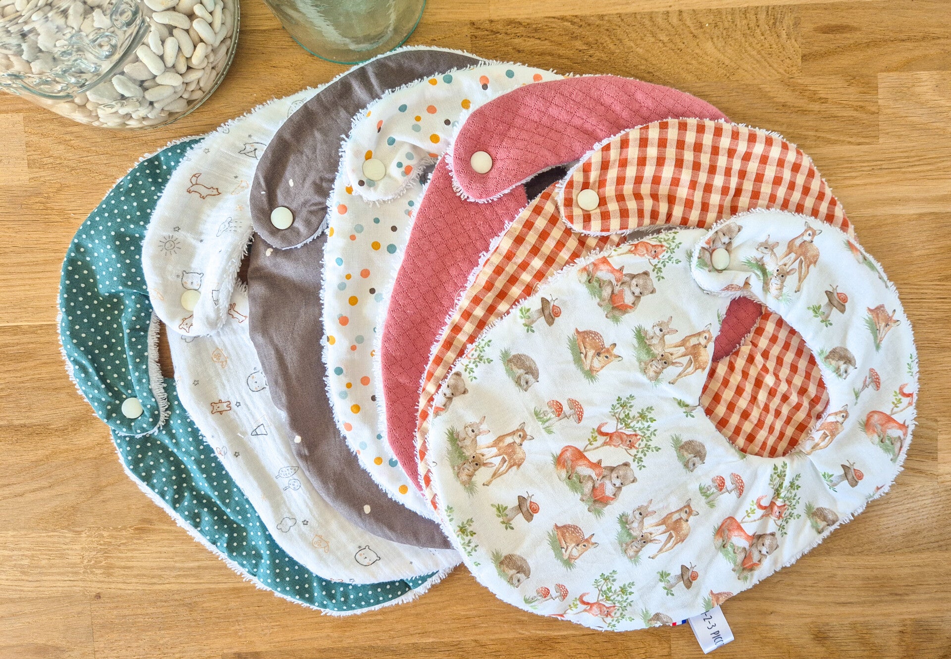 Le semainier de bavoir est un lot de 7 bavoirs avec des tissus fantaisies colorés . Un bavoir par jour.