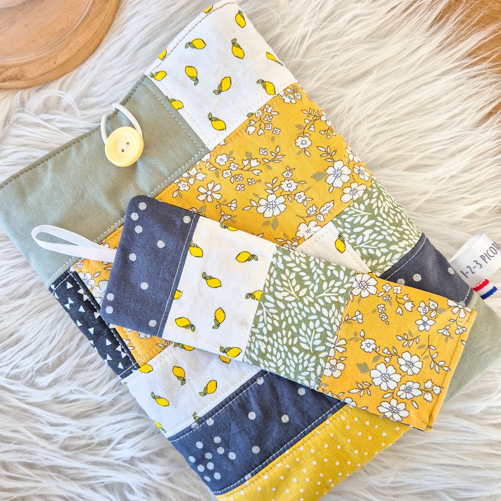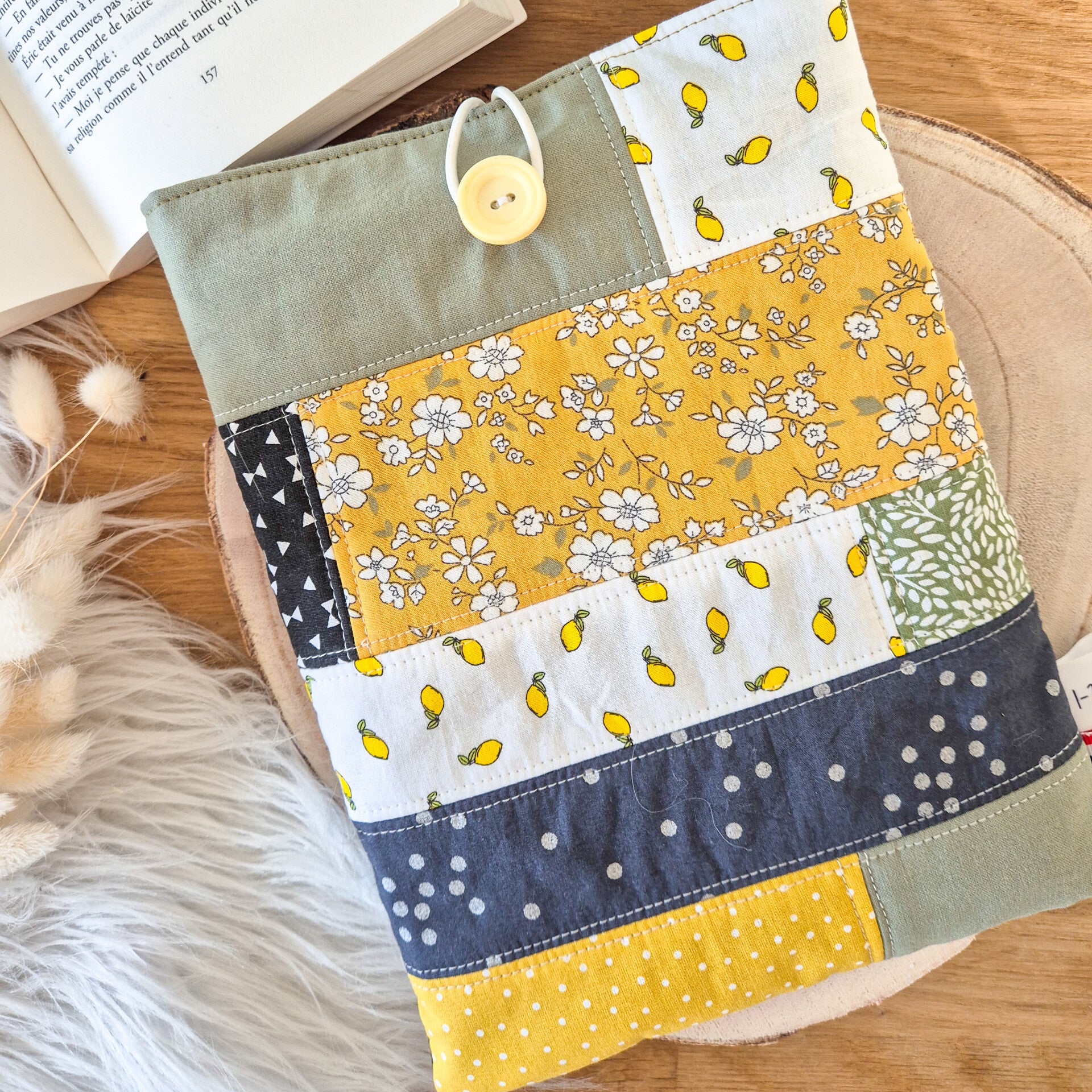 Un pochette à livre tout en tissu , légérement ouatiné avec son marque page assortie .Fait avec soin style patchwork.
