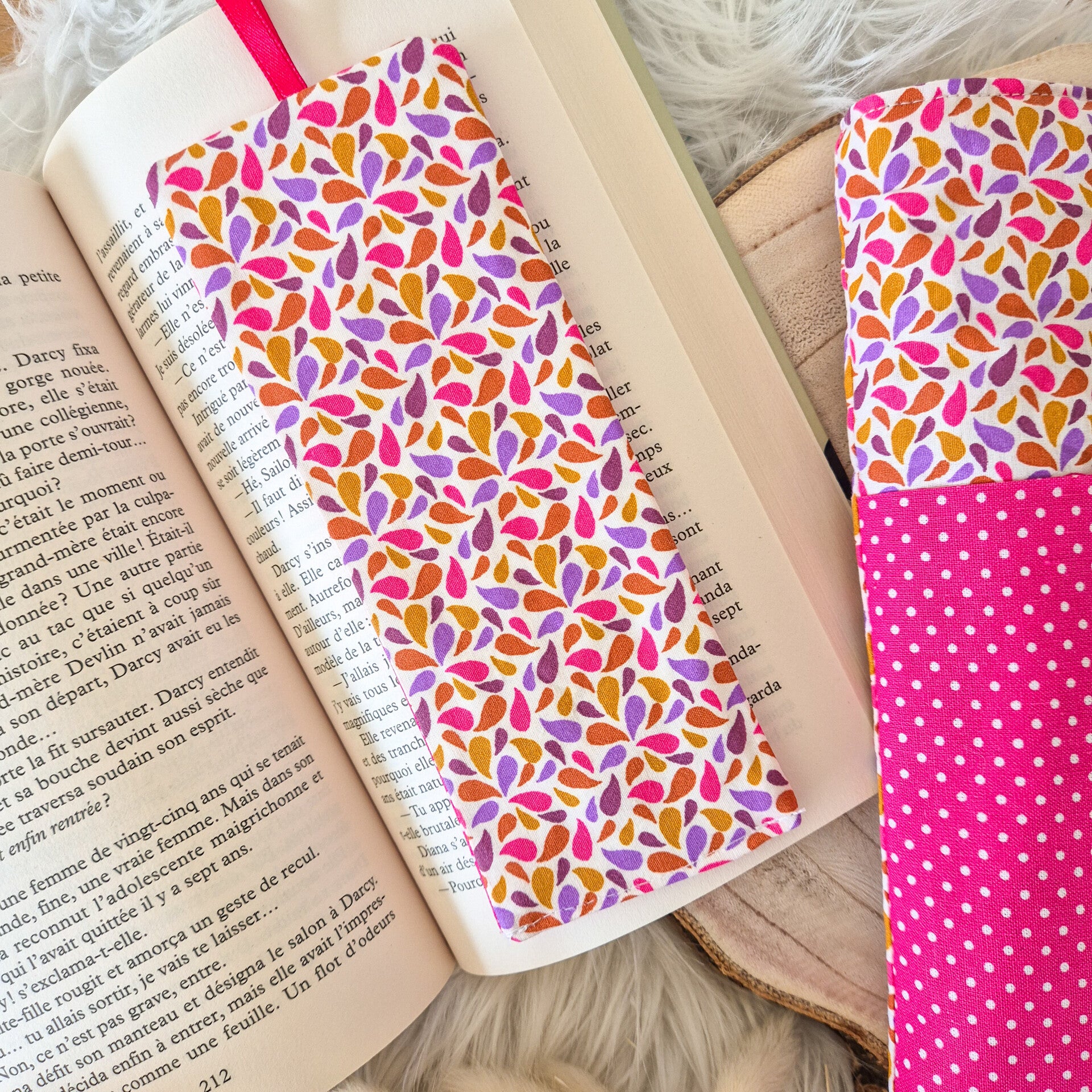 Un pochette livre tout en tissu , légérement ouatiné avec son marque page assortie, devant une poche pour y glisser lunette , stylo .Fait avec soin .