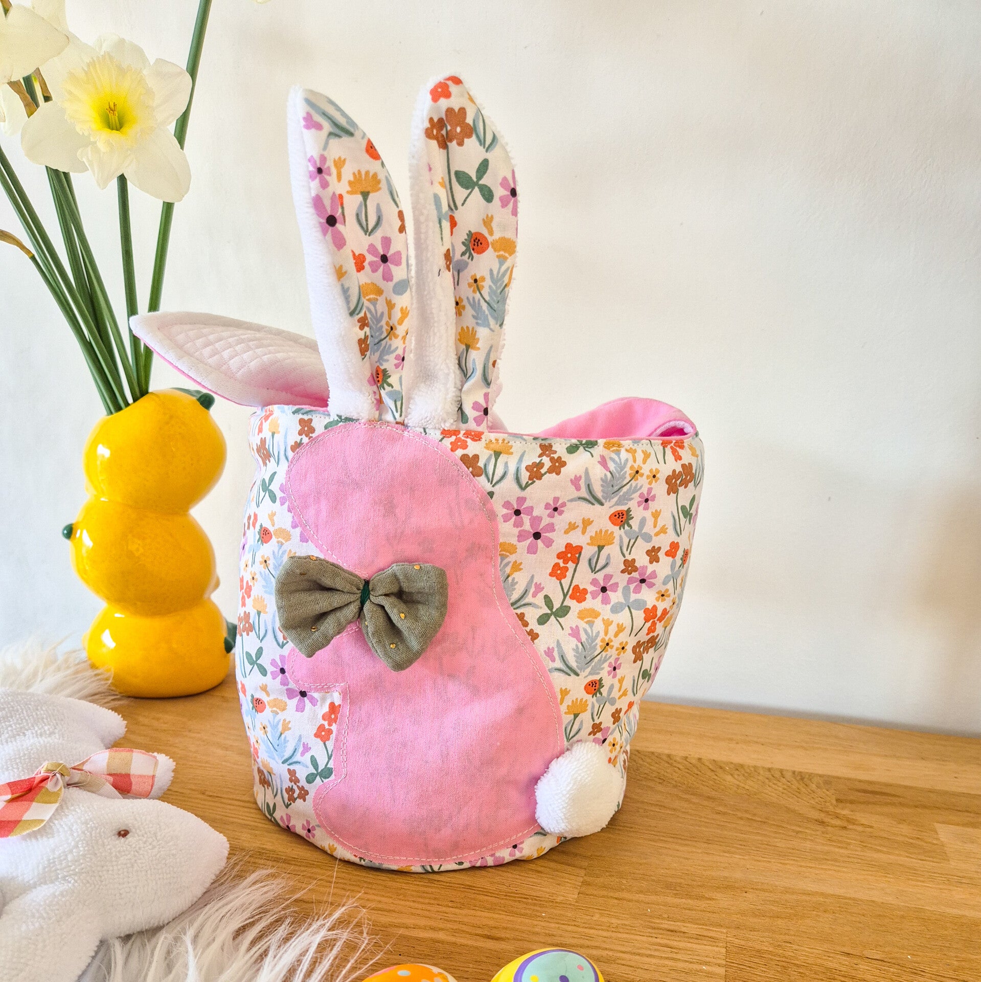 Un petit panier de pâques avec un lapin en application avec des oreilles, un pompon et un nœud sur le devant.