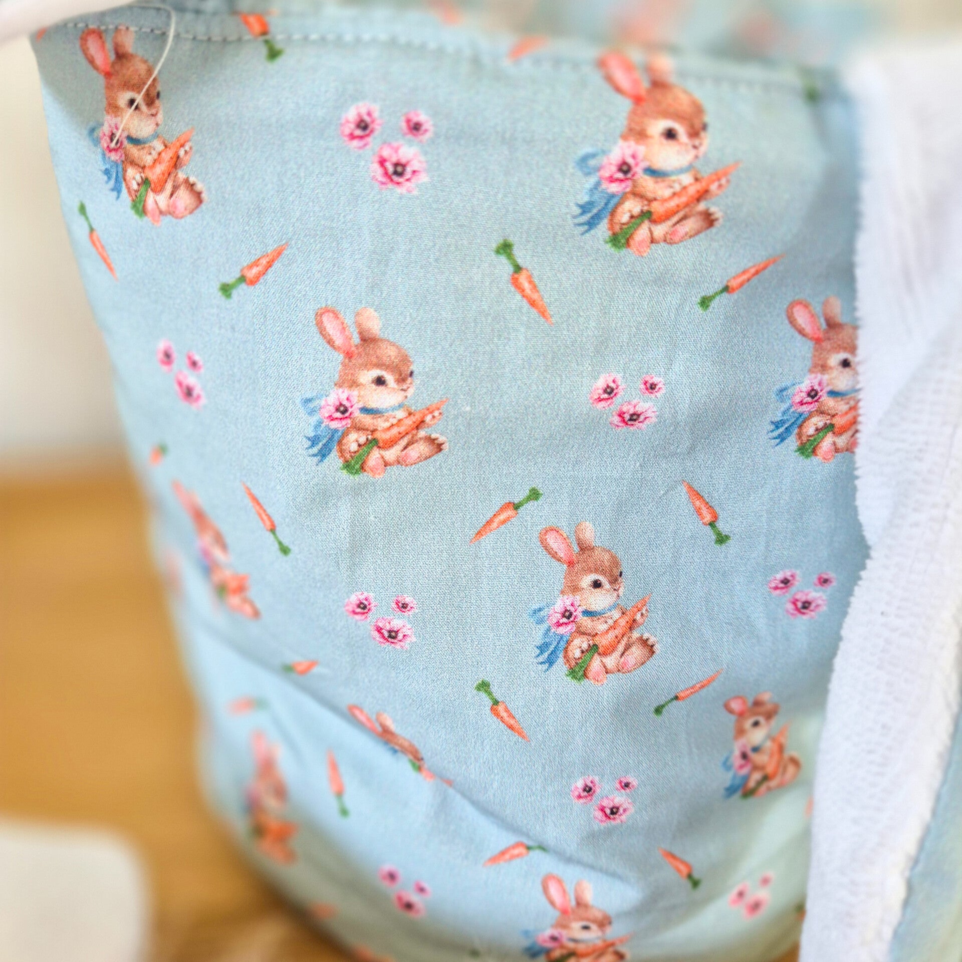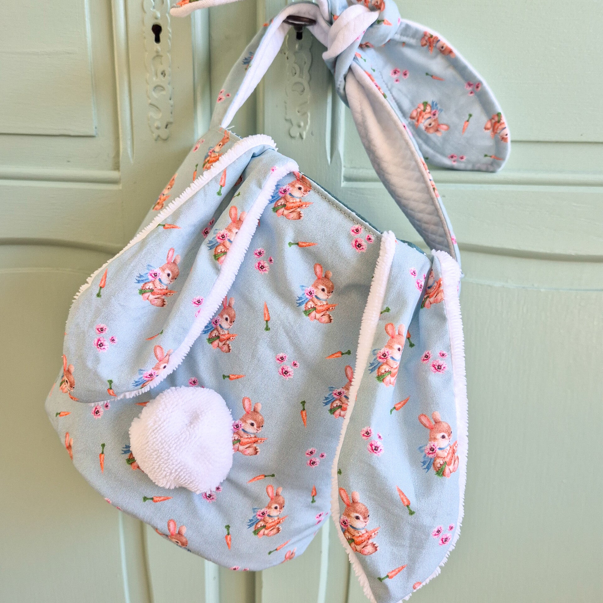 Les anses en forme d' oreilles de lapin sont en tissu. Assez grand pour mettre beaucoup de chocolat.