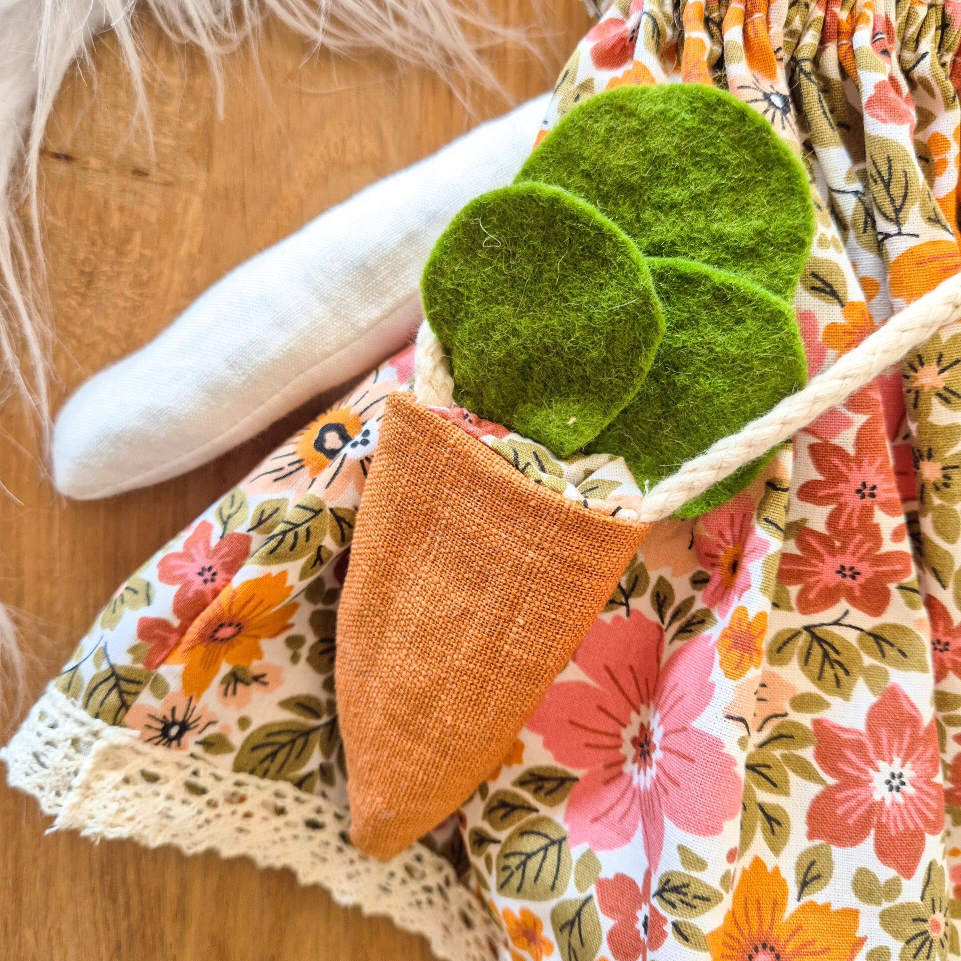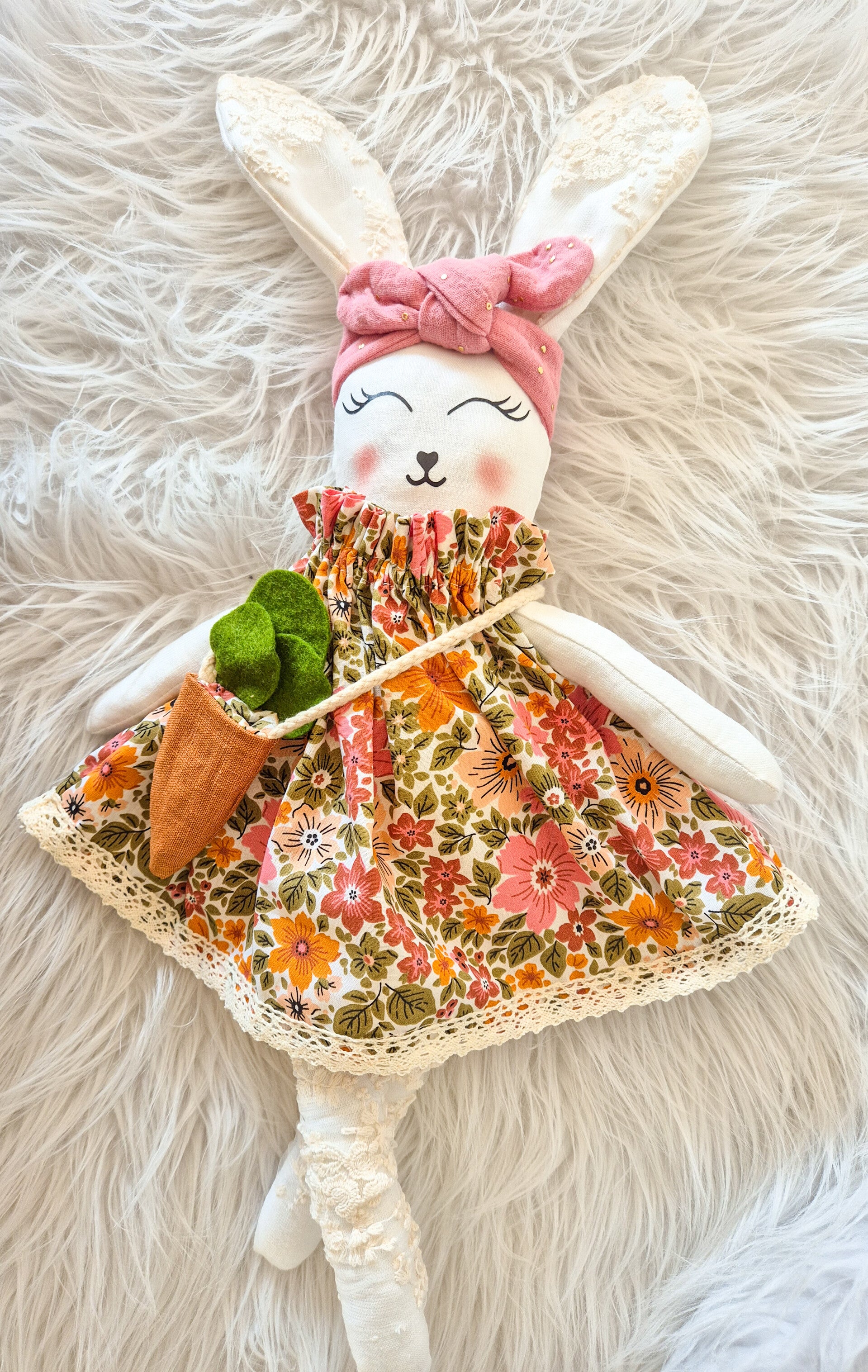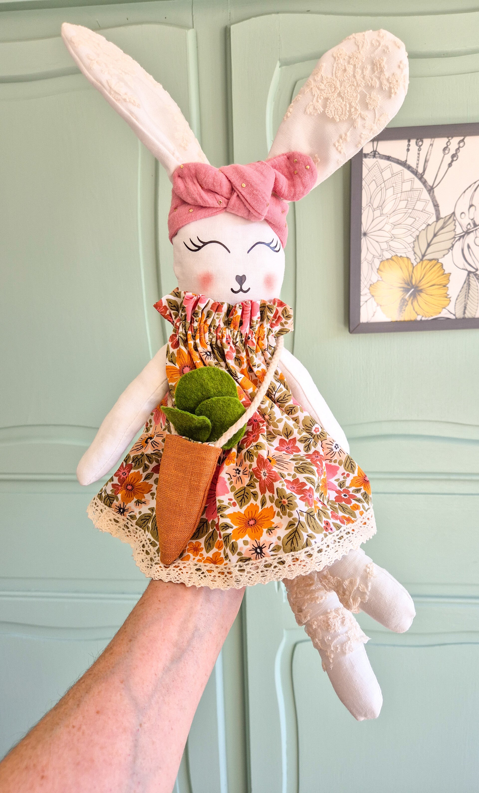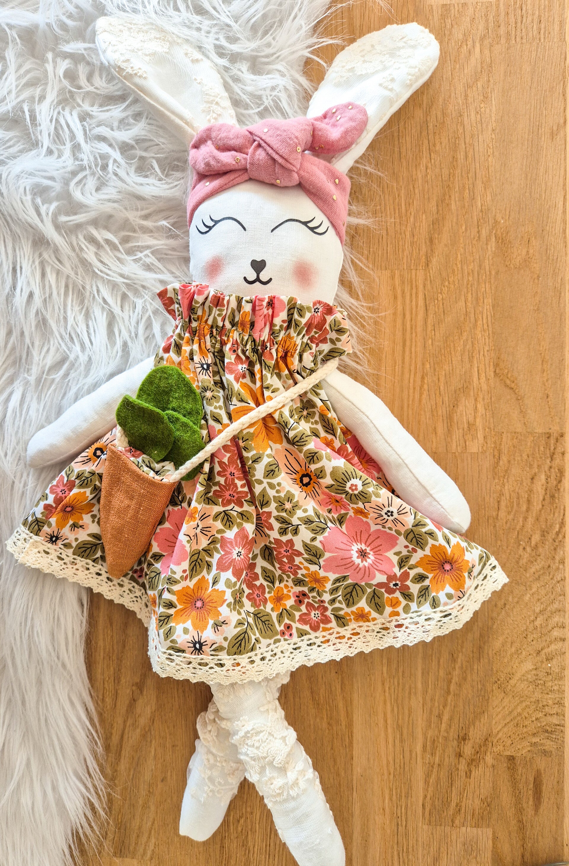 Un lapin tout en tissu tout habillé avec son sac carotte .Chaque lapin est fait à la main .